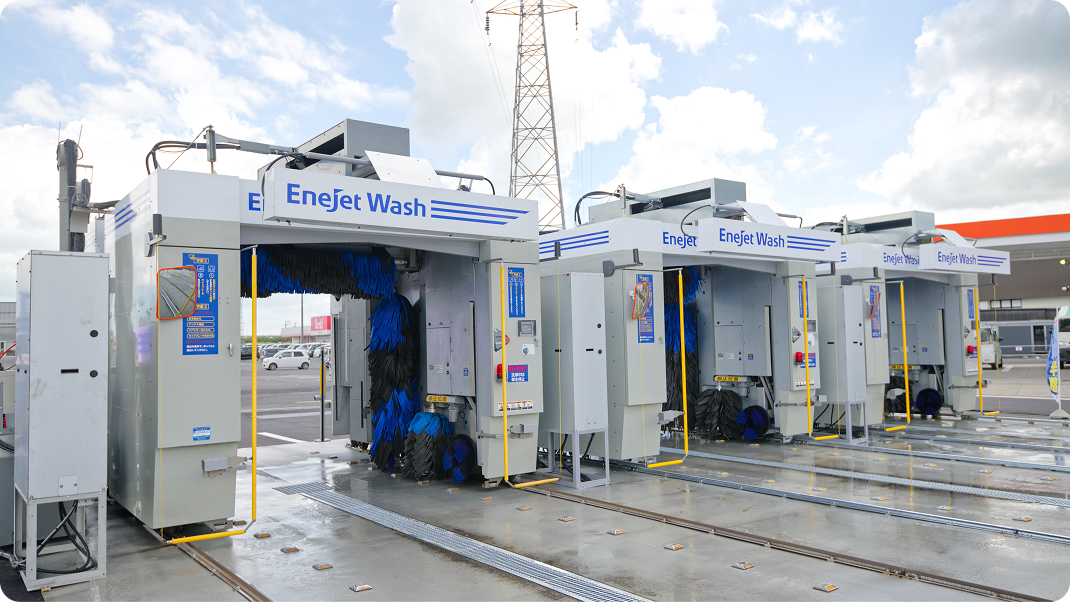 「EneJet Wash」をはじめとする最新鋭の洗車機を導入しています。スピーディーな洗浄に加え、クリーミーな泡で汚れを包み込む「泡洗浄」や、強力な撥水効果を持つ「ガラス系コーティング」など、多彩なメニューをご用意。