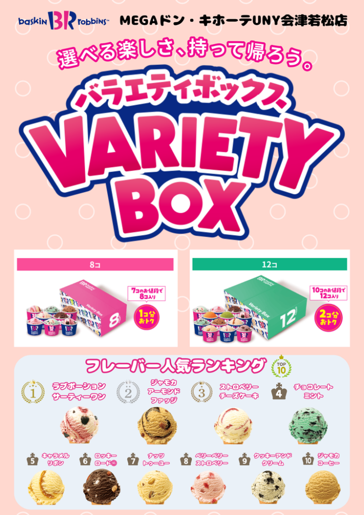 会津ゼネラルグループが運営する『サーティワンアイスクリームMEGAドン・キホーテUNY会津若松店』では、年末年始におススメのバラエティボックスを販売しております!